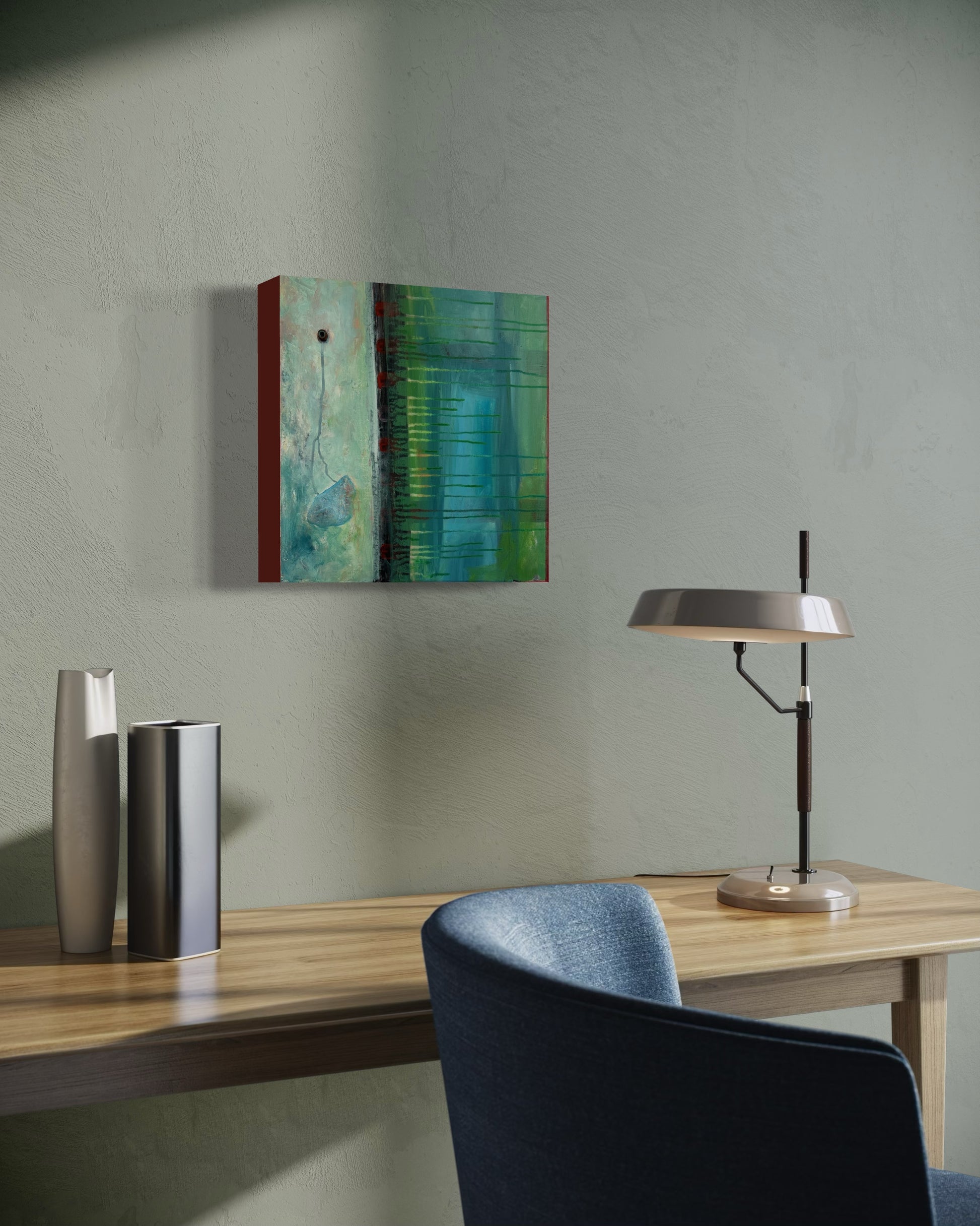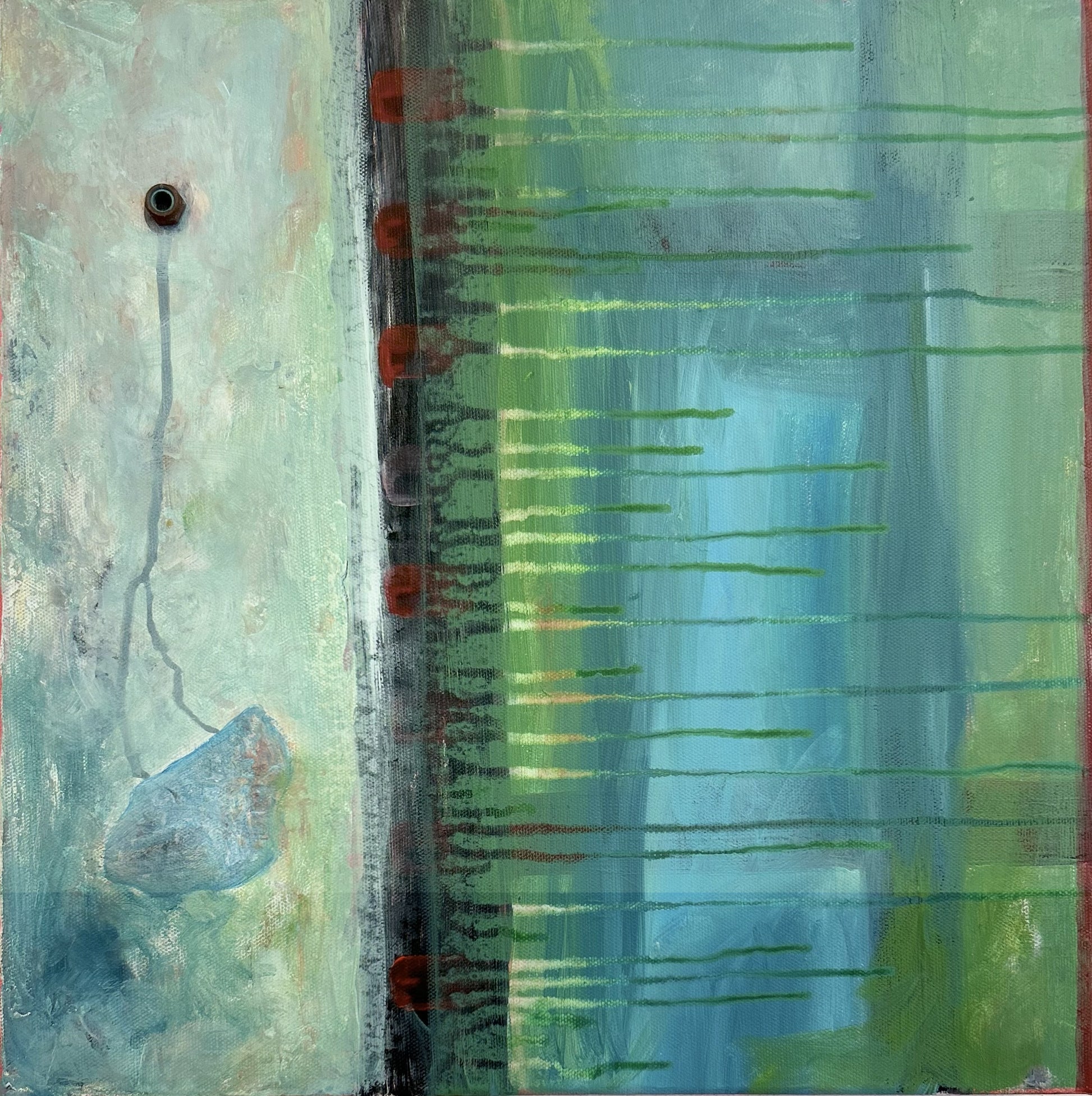 Part of the connections collection, this piece uses the idea of rust creeping and strengthening over time as a metaphor for connections between people that deepen over time. the patina of the copper in the embedded bolt echoes the green in the rest of the painting.